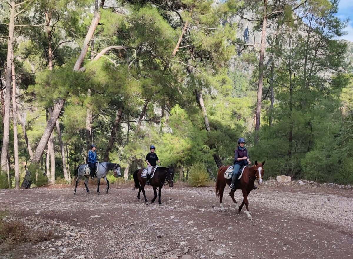 Day 2: After a hearty breakfast, your ride starts at around 11 am. First you ride through the village and on into the Mediterranean forest to Bogazi Canyon, where your lunch picnic awaits you. You can bathe and relax at the canyon before heading back along the forest paths at all paces, past some rocks. In the evening there is still some time for shopping in Kemer (cloth, spices, teas etc.) or for a visit to the Turkish bath. Riding time approx. 4 hours.