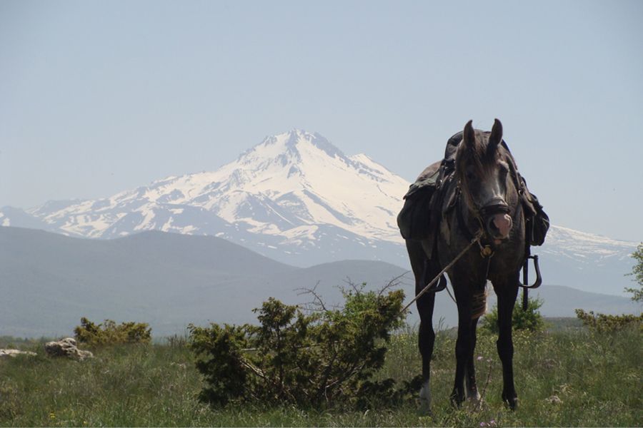 On your second day of riding, you follow the Melendiz mountain trail, passing Kitreli and a historic Greek village called Ilemi at the corner of Melendiz. Then you cross Yenipinar, where the shepherds used to bring their sheep to drink, and finally reach your camp in Eghrikuyu on the edge of the Hassan (3268 m). (Riding time: approx. 5 hours).