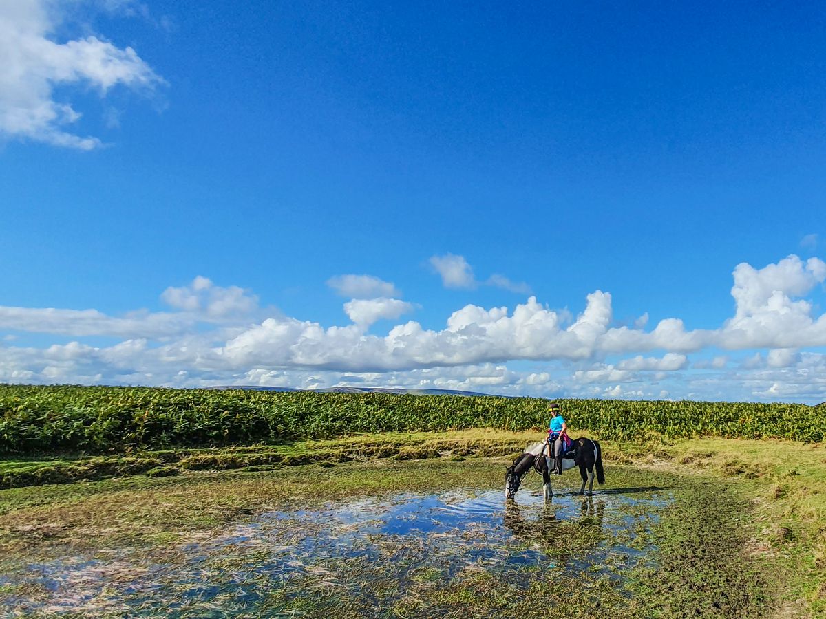 On this trail you will cross Wales from east to west, up to the coast of the Celtic Sea, overlooking Ireland. On a distance of about 160km over hills and valleys you will get to know a mystical and wild Wales. The ride to the coast is very varied and leads over winding paths, open hills, river crossings and beautiful green plains. The trails are a mixture of little-used farm tracks, bridleways, old local roads and routes through the Cambrian Mountains. The riding pace varies and adapts to the terrain. When you arrive at the Celtic Sea, you can expect a lively gallop! You ride between 6 and 7 hours a day.